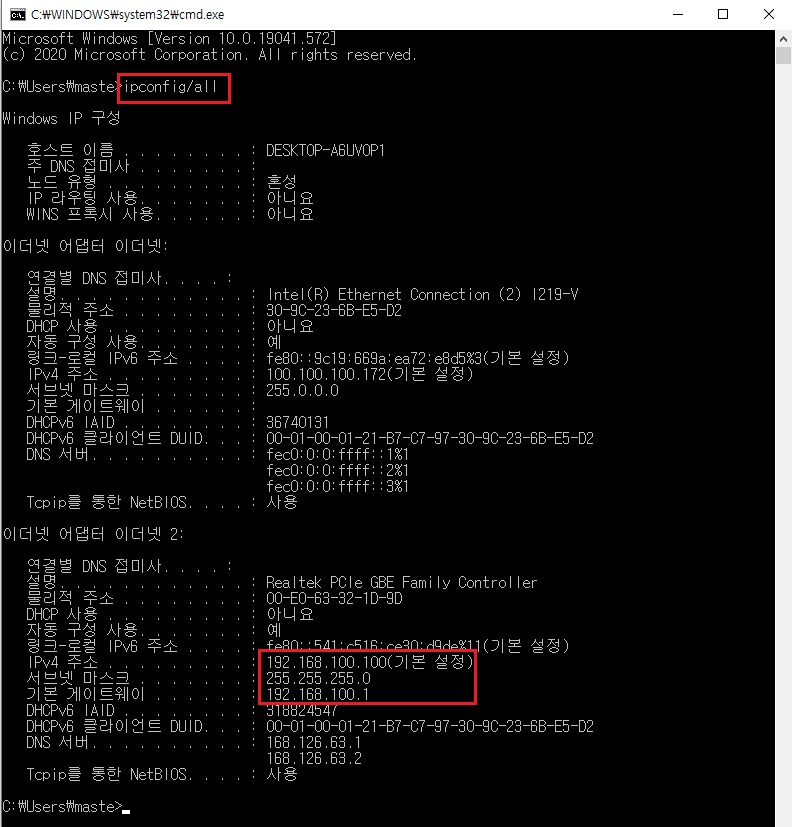 그외 DHCP에서 아이피를 다시 받아오고 싶을때는 ipconfig/release 해서 아이피를 던져버리구요. ipconfig/renew 해서 다시 받아 올수 있습니다.