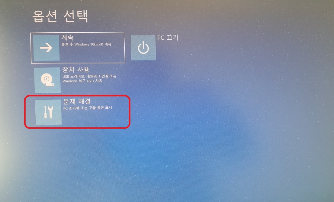 옵션 선택 화면에서 문제 해결을 클릭합니다.