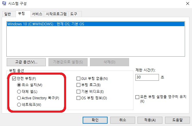 다른 방법으로 직접실행에서 msconfig 로 시스템 구성을 열어서 부팅탭에 안전부팅을 체크하면 됩니다.