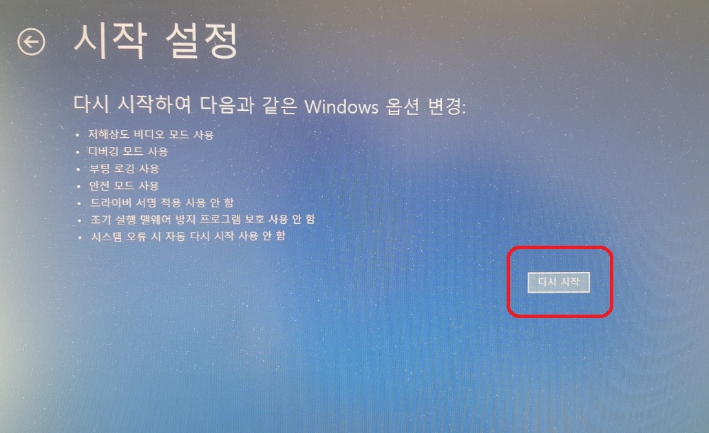 시작 설정 화면에서 다시 시작을 클릭합니다. 컴퓨터가 재부팅후 안전모드를 선택할수 있는 시작설정 화면을 만나게 됩니다.
