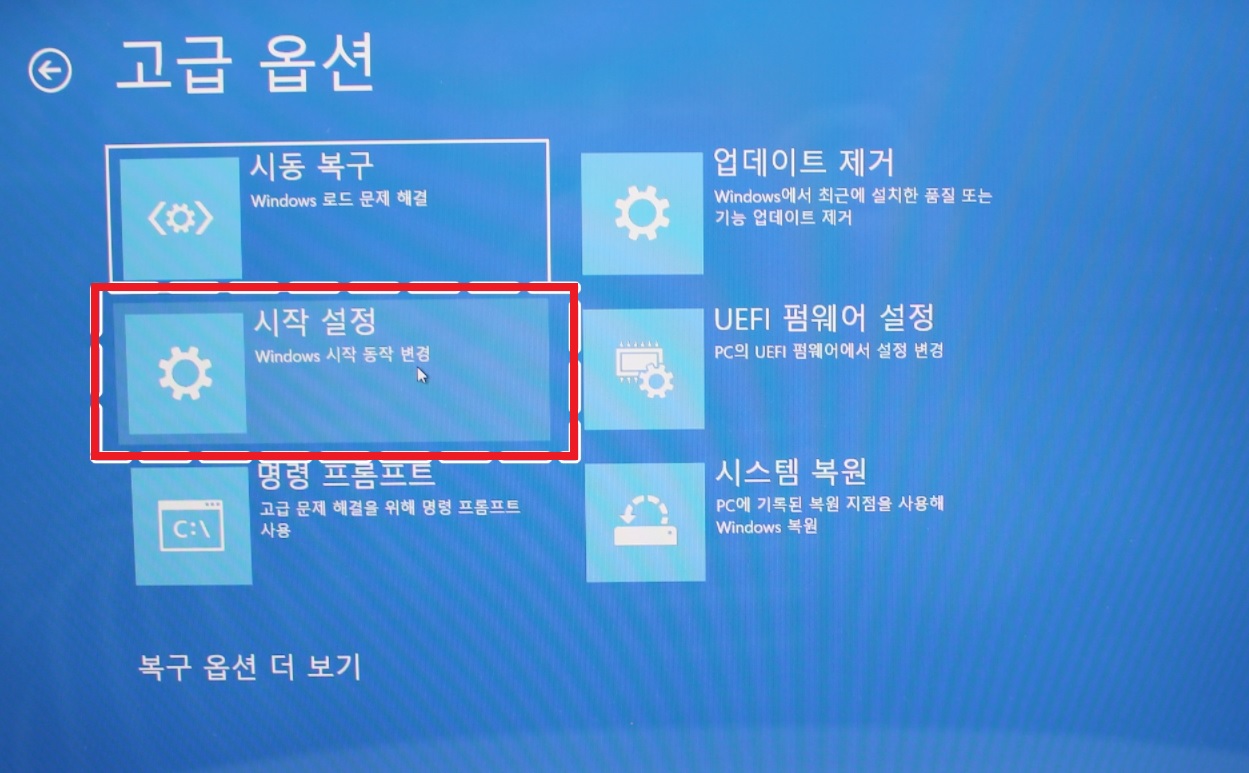 고급 옵션 화면에서 시작 설정을 클릭합니다.