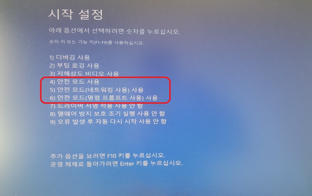 4, 5, 6 번이 안전모드이며 설명에 나와 있듯 네트워킹을 사용하는지 않하는지, 그리고 명령 프롬프트에서 사용을 할지 선택을 하시면 됩니다. 일단 숫자키의 4를 누르면 안전모드로 부팅이 됩니다.